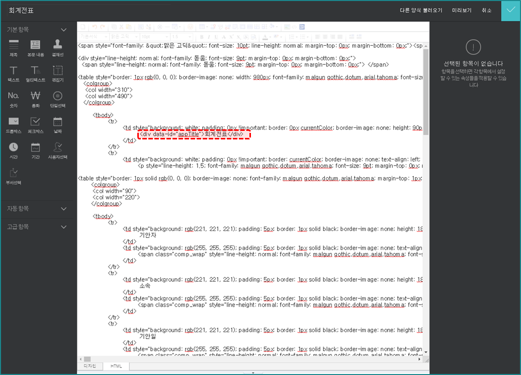 2. 제목 및 결재방 등을 등록하여 양식 디자인을 진행한 후 양식편집기 하단 [HTML] 클릭
