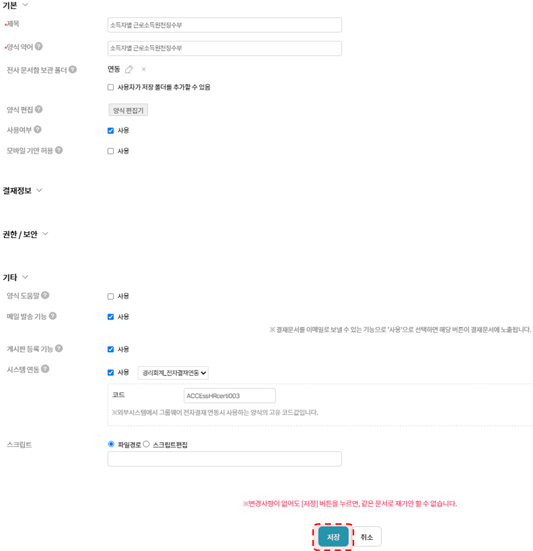 6️⃣ 전자결재 연동양식 설정 정보를 확인 후 [저장] 클릭하여 저장합니다.