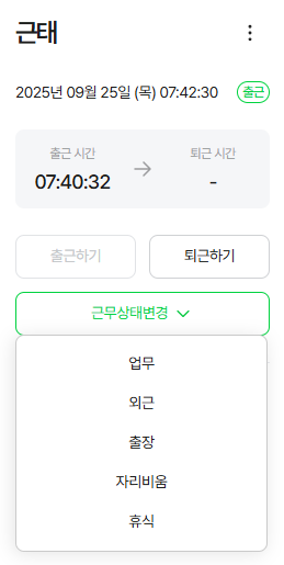 - PC: ๋์๋ณด๋ ์ฐ์ธก์ [๊ทผํ] ์์ ฏ ๋๋ PC ๋ฉ์ ์ ์๋จ์ [์ถ๊ทผ/ํด๊ทผ] ๋ฒํผ ์ ํ