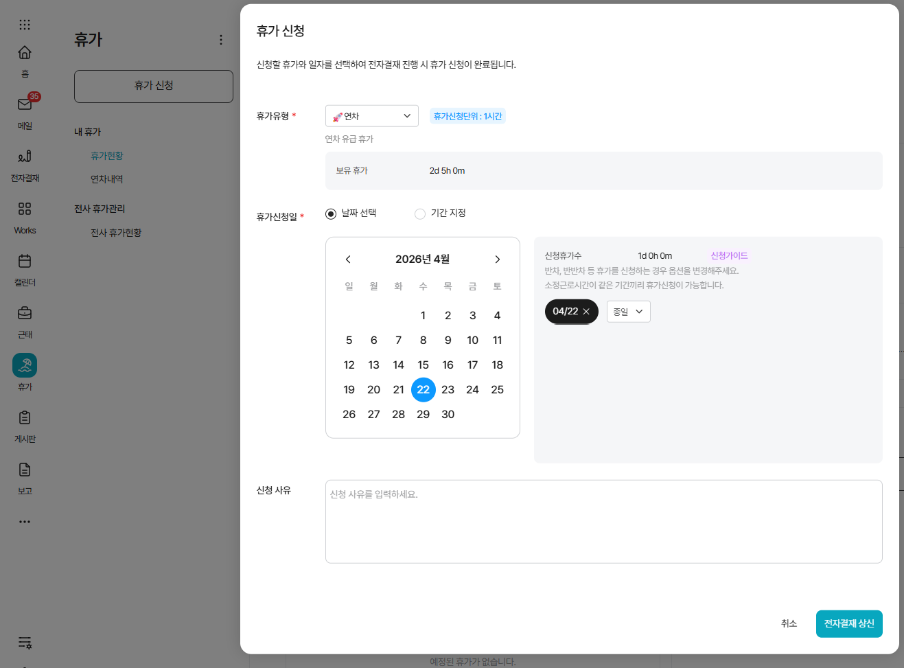 - ๋์ ์์ฌ ์ฐ์ฐจ๋ฅผ ํ์ธํ ๋ค, [ํด๊ฐ ์ ์ฒญ]์์ ์ ์ฌ๊ฒฐ์ฌ ์์ ๐ํด๊ฐ ์ ์ฒญ ๋ฐ ํด๊ฐ ํํฉ