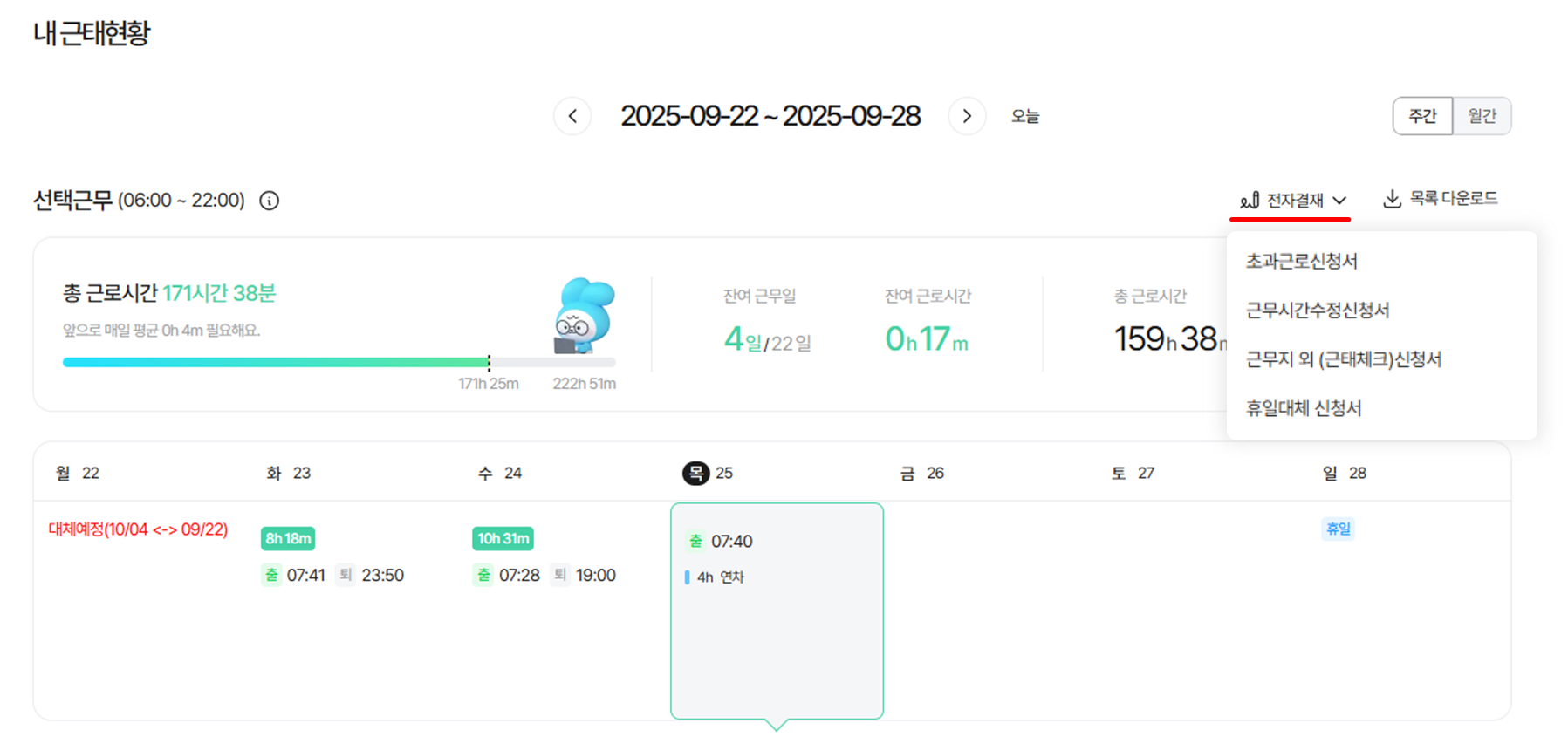 - ์ด๊ณผ๊ทผ๋ก / ๊ทผ๋ฌด์๊ฐ ์์ / ๊ทผ๋ฌด์ง ์ธ ์ ์ฒญ์ 6. ์ ์๊ฒฐ์ฌ ์ด์ฉ์์ ํ์ธํด ์ฃผ์ธ์.
