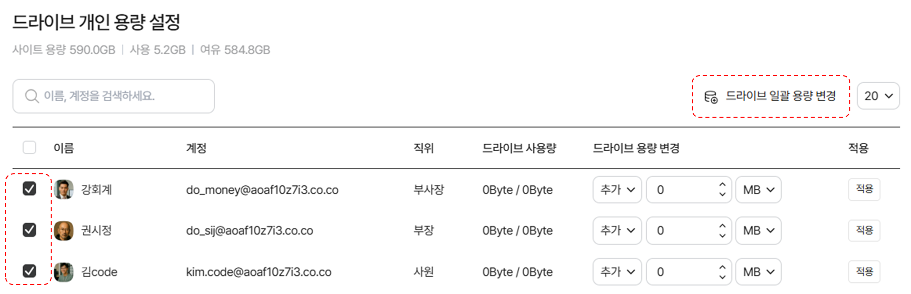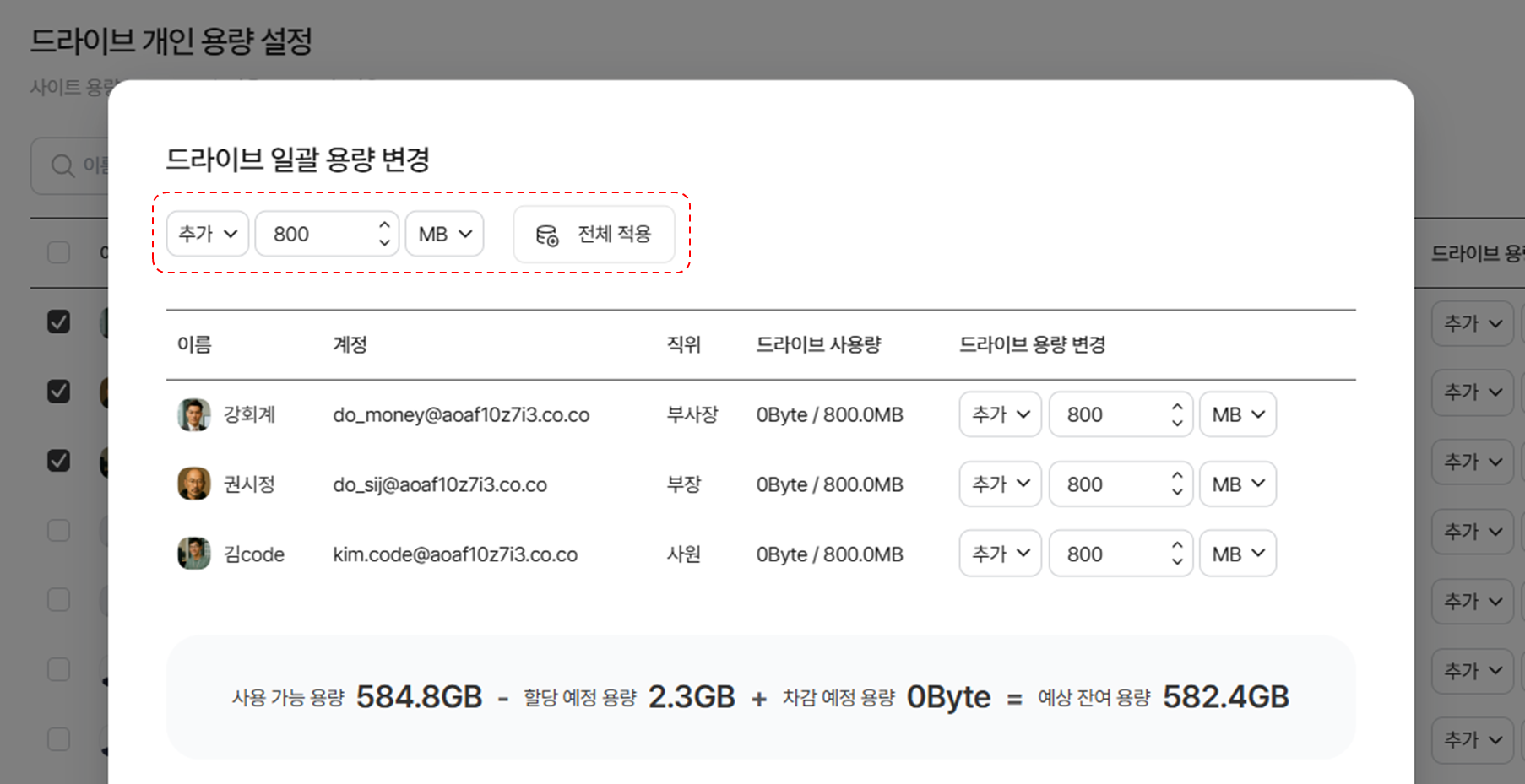 [적용] 클릭 시 선택한 임직원에게 개인 드라이브 용량 일괄 반영