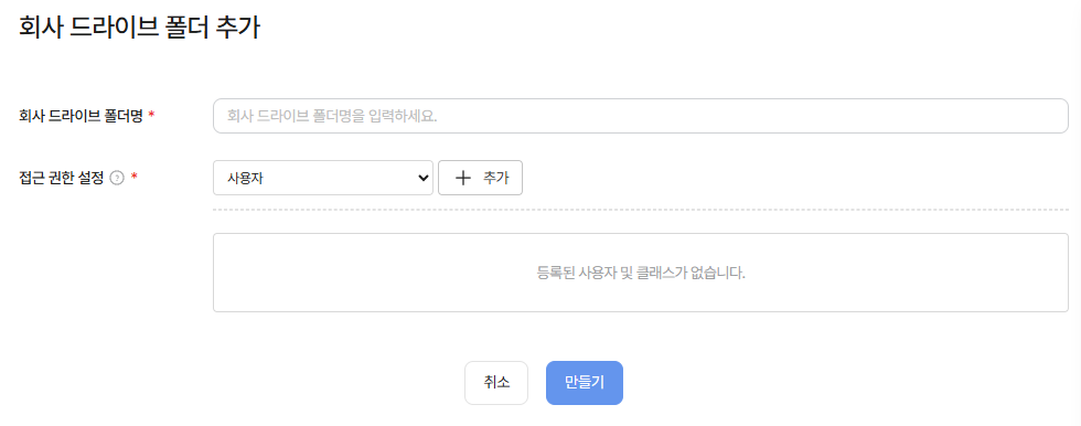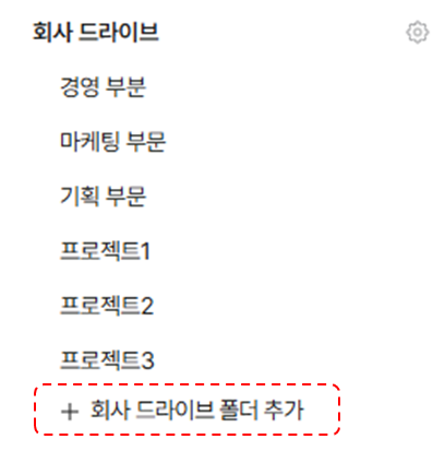 회사 드라이브 > [➕ 회사 드라이브 폴더 추가] 선택해 폴더명과 접근 권한을 설정할 수 있습니다.