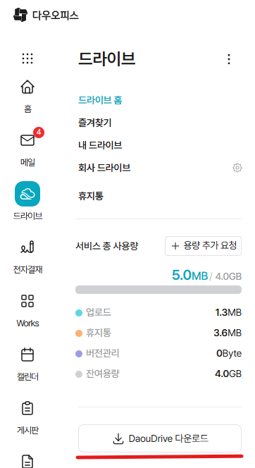 🧭 임직원포털 > [드라이브] App에서 [DaouDrive 다운로드] 버튼을 선택하면 사용 중인 PC 운영체제에 맞는 설치 파일이 다운로드됩니다.