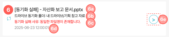 동기화 실패 내역은 파일 단위로 표시되며, 문제 해결이 필요한 경우 추가 확인 안내가 함께 제공됩니다.