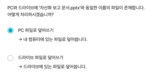 - PC 파일로 덮어쓰기 (기본) : PC 파일 버전으로 드라이브에 덮어써서 동기화