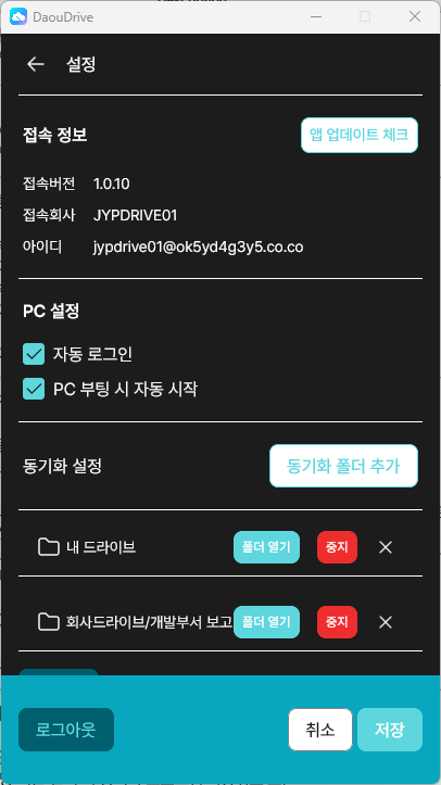 현재 PC 동기화 프로그램에 로그인된 계정 정보와 접속 정보를 확인할 수 있습니다.