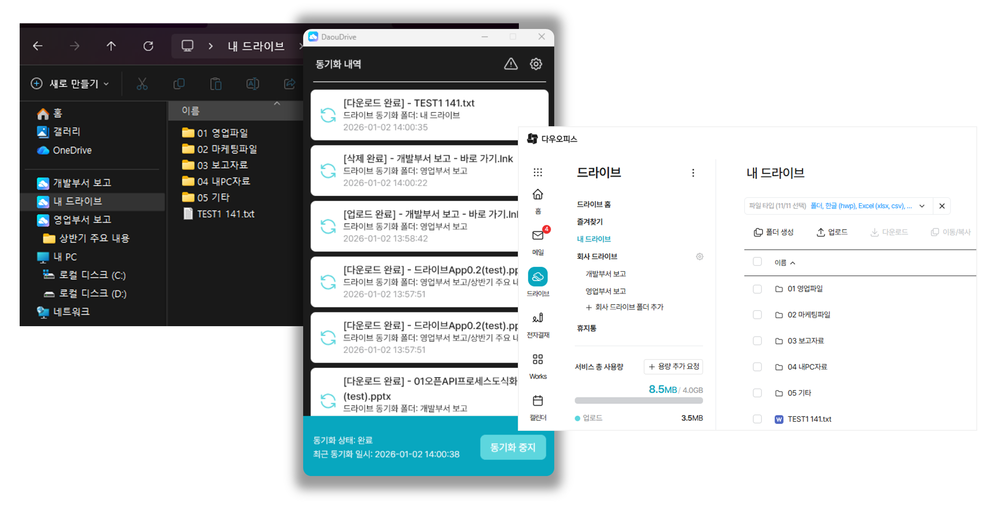 - 웹에서 파일을 업로드하거나 수정하면 → PC 탐색기의 DaouDrive 폴더에 반영