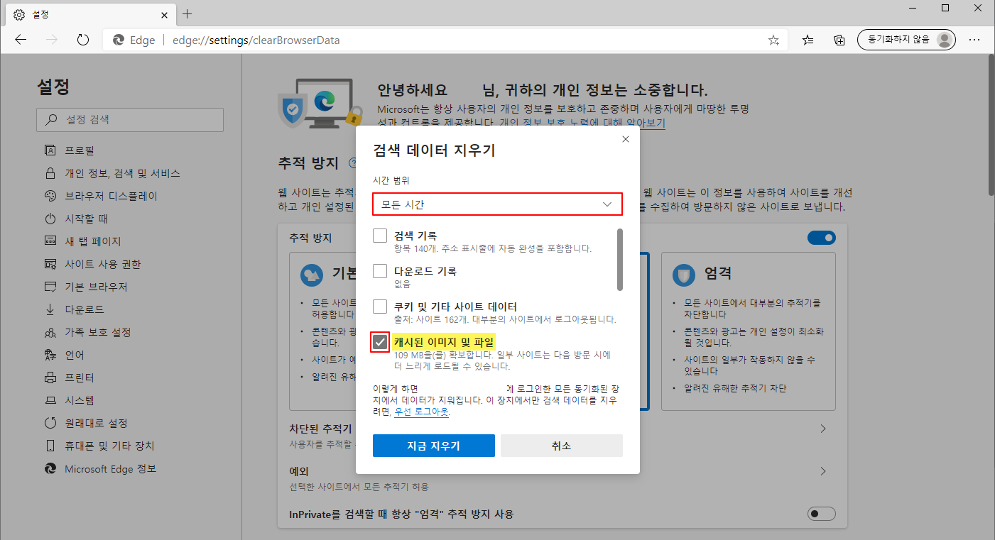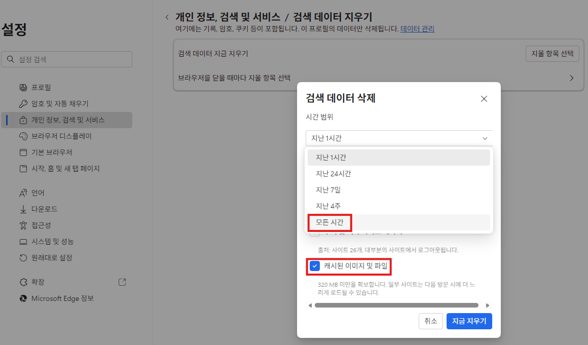 Edge 브라우저 캐시 삭제 방법