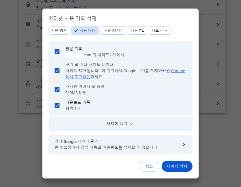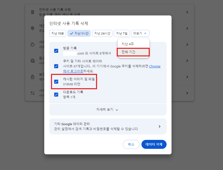 - '캐시된 이미지 및 파일' 체크