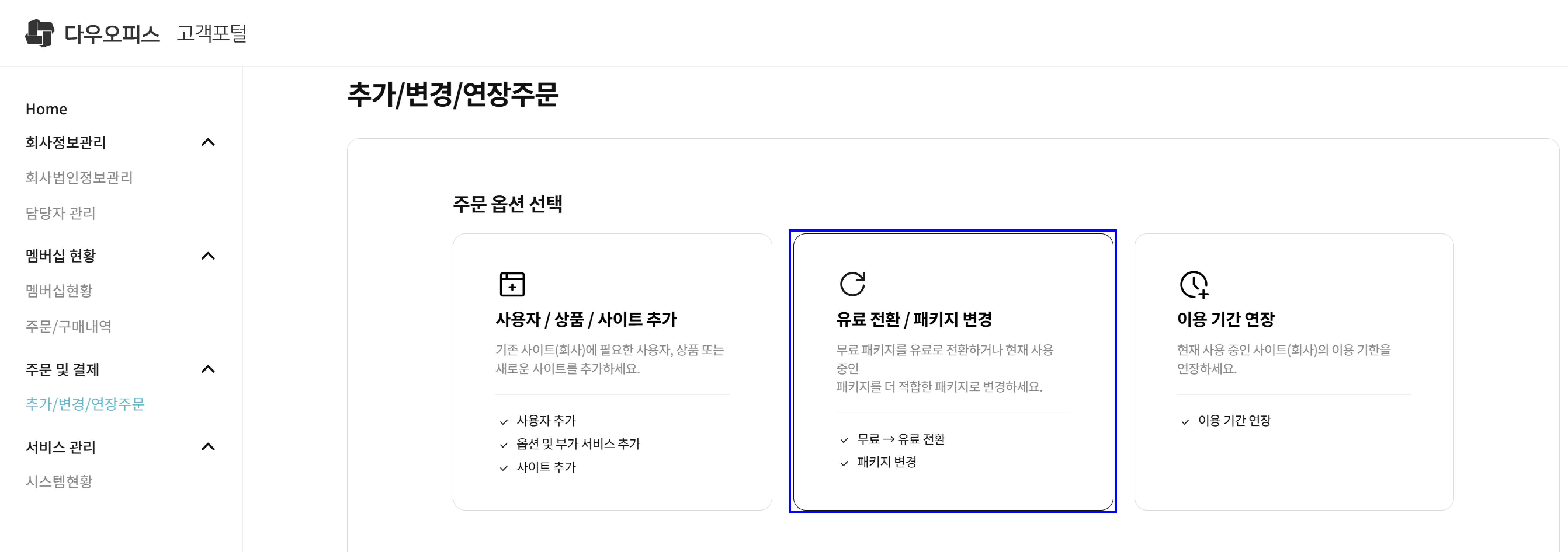 경로 : 🧭 고객포털 > 주문 및 결제 > 추가/변경/연장주문 > 유료 전환/패키지 변경