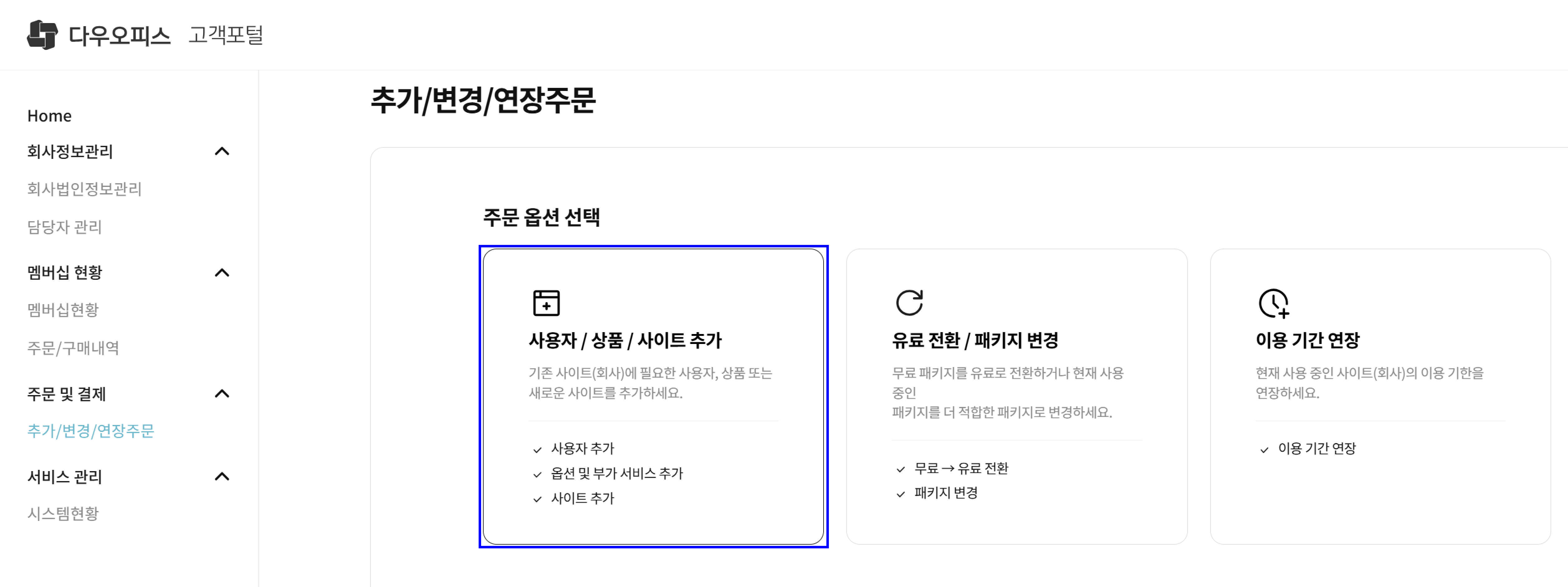 경로 : 🧭 고객포털 > 주문 및 결제 > 추가/변경/연장주문 > 사용자/상품/사이트 추가