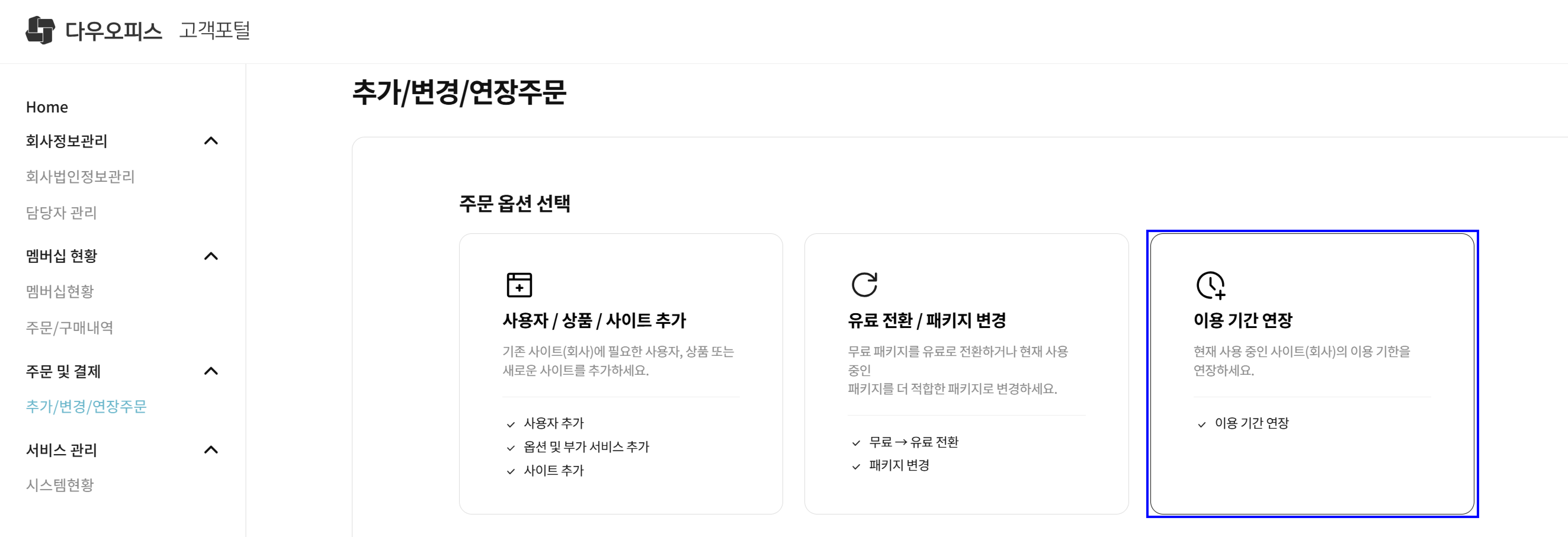 경로 : 🧭 고객포털 > 주문 및 결제 > 추가/변경/연장주문 > 이용 기간 연장