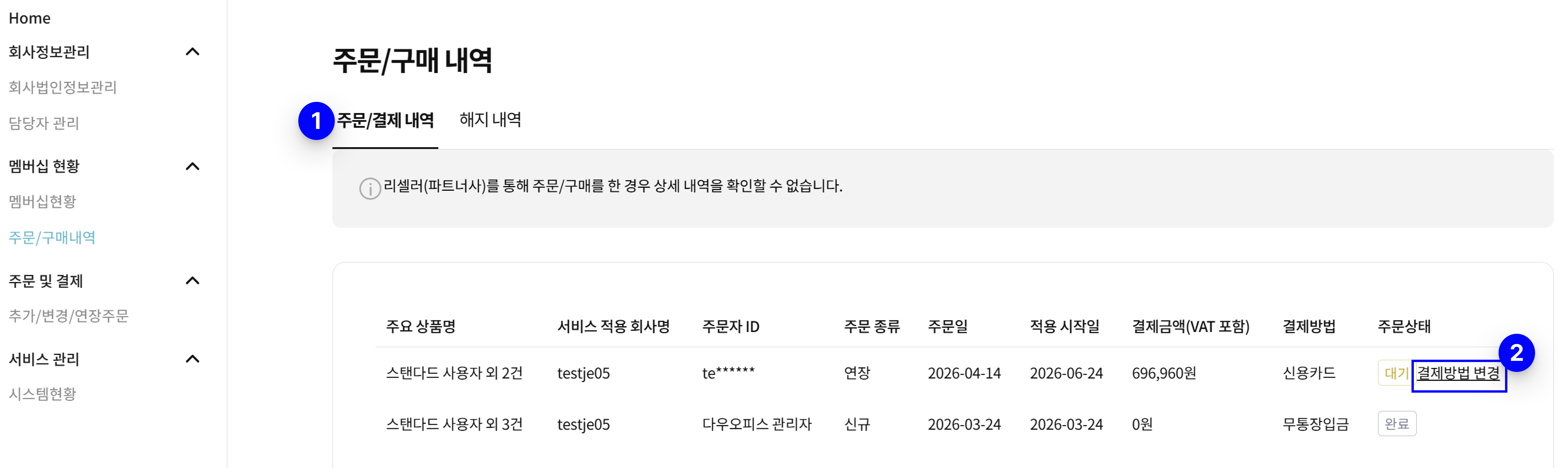 결제/결제수단 변경 : [대기] 상태의 주문 건 우측 [결제방법 변경] 클릭 후 결제 진행