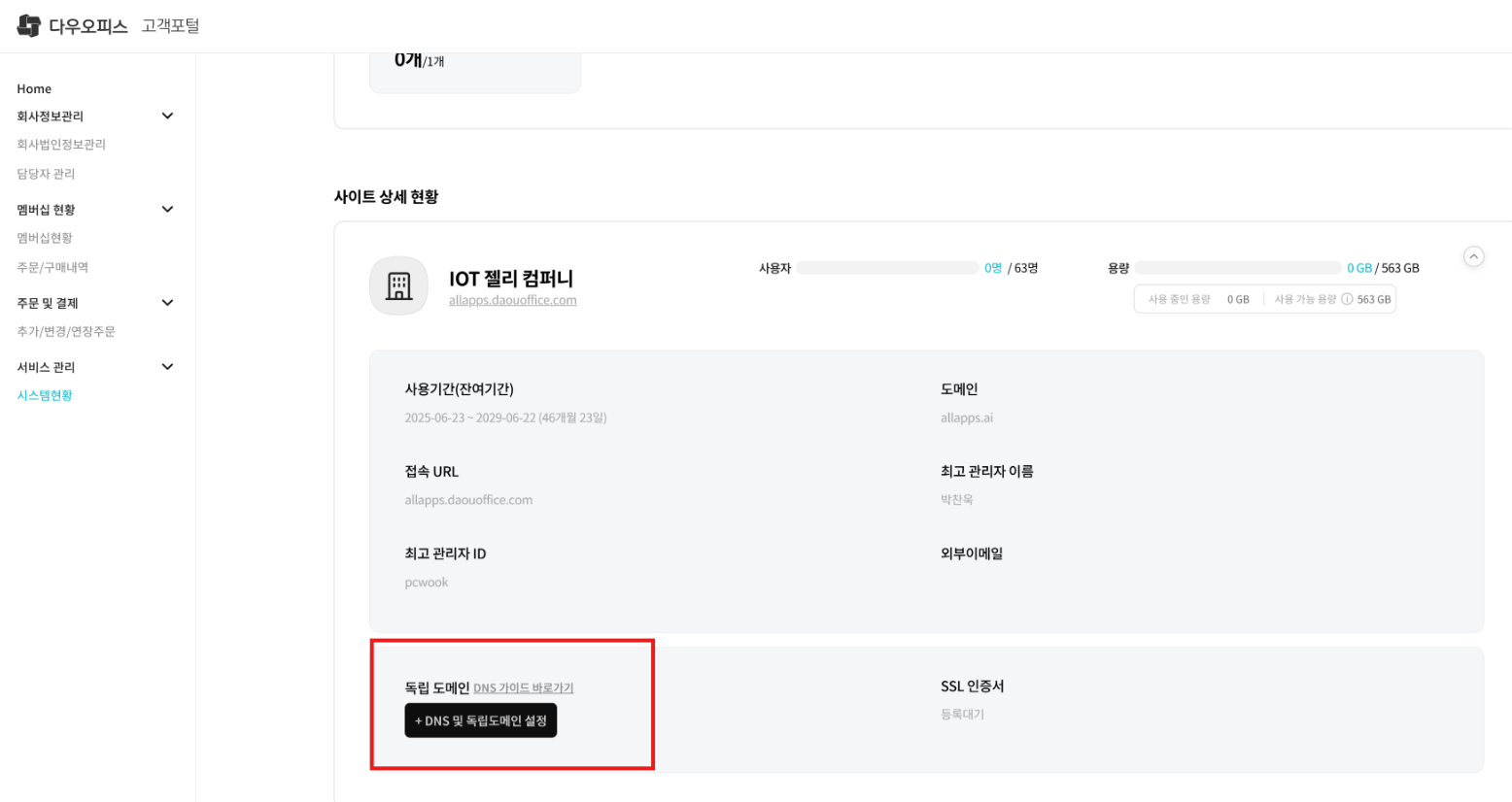 ④ 저장 후 설정한 독립도메인 적용 확인 (초기에는 DNS 메뉴가 비활성화될 수 있으며 고객센터 문의 필요)